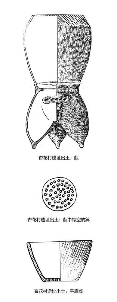 也就是说,甗有两个发源地,一个是河南安阳,中间的箅子是另做的,用时放上去;而杏花村的陶甗,箅子和甗是一体烧制的,这就是酿造酒时代的甑桶。